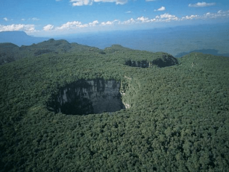 On the flat-topped mountain of Cerro Sarisarinama in southwest Venezuela, gravity has punched four perfectly circular holes nearly 1,000 feet deep into a landscape of remote rainforest. Hundreds of miles from the nearest road, the area is so far removed from civilization that the sinkholes weren’t discovered until 1961, when they were spotted by a pilot flying over the mountain.